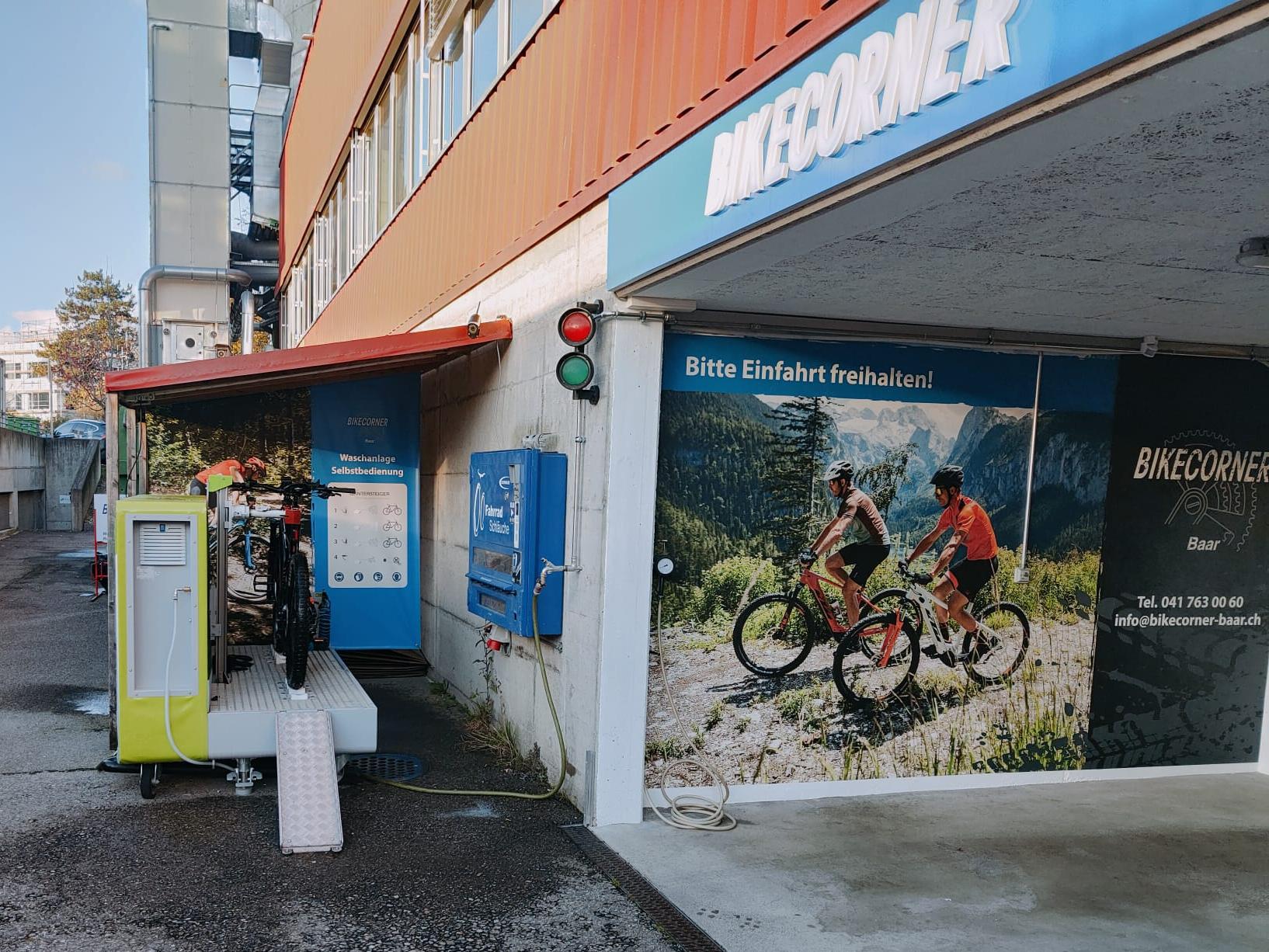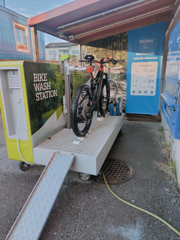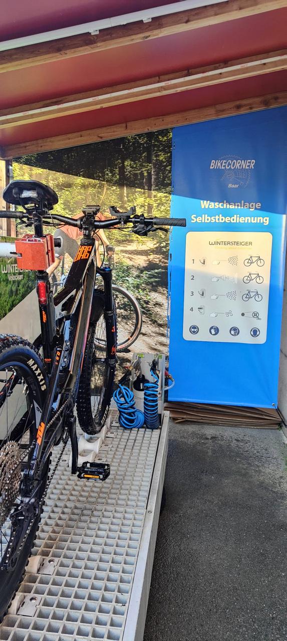 Die Bike-Waschanlage von Wintersteiger ist neben unserem Eingang installiert und auch nach Ladenschluss in Betrieb. Sie arbeitet mit Niederdruck und schont so die Lager.